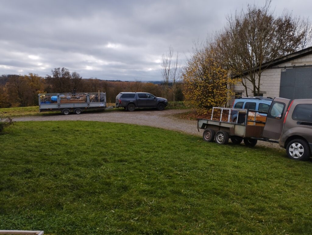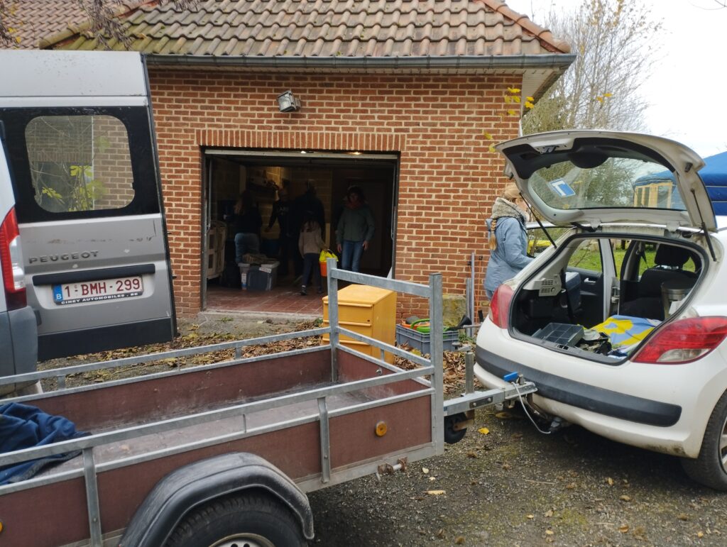 Ce mardi 11 novembre, point de repos pour les braves.Les membres de l’ASBL Les 4 Eléments ont profité de ce jour férié pour emménager au Domaine des ColibrYs. Un convoi de voitures et de remorques débarque à Vierset-Barse. La petite équipe est prête à décharger les caisses, le matériel, les meubles, les jeux en bois,… Tout se coordonne à merveille et, en milieu d’après-midi, tout est déchargé. Il ne reste plus qu’à déballer quelques caisses.